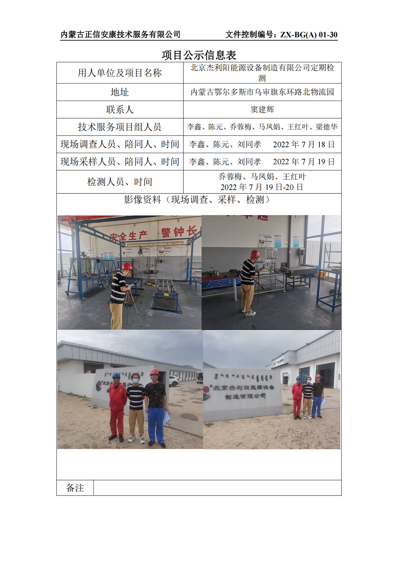 北京杰利陽(yáng)能源設備制造有限公司定期檢測項目公示