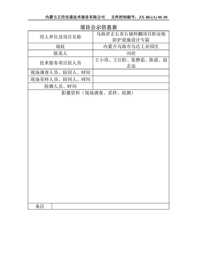 烏海君正石灰石儲料棚項目職業(yè)病防護設施設計專(zhuān)篇項目公示