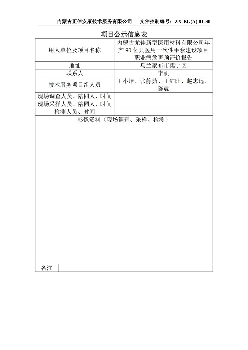 內蒙古尤佳新型醫用材料有限公司年產(chǎn)90億只醫用一次性手套建設項目職業(yè)病危害預評價(jià)報告公示信息表