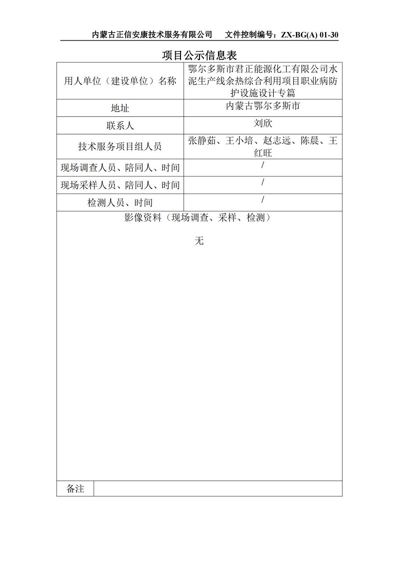 鄂爾多斯市君正能源化工有限公司水泥生產(chǎn)線(xiàn)余熱綜合利用項目職業(yè)病防護設施設計專(zhuān)篇項目公示