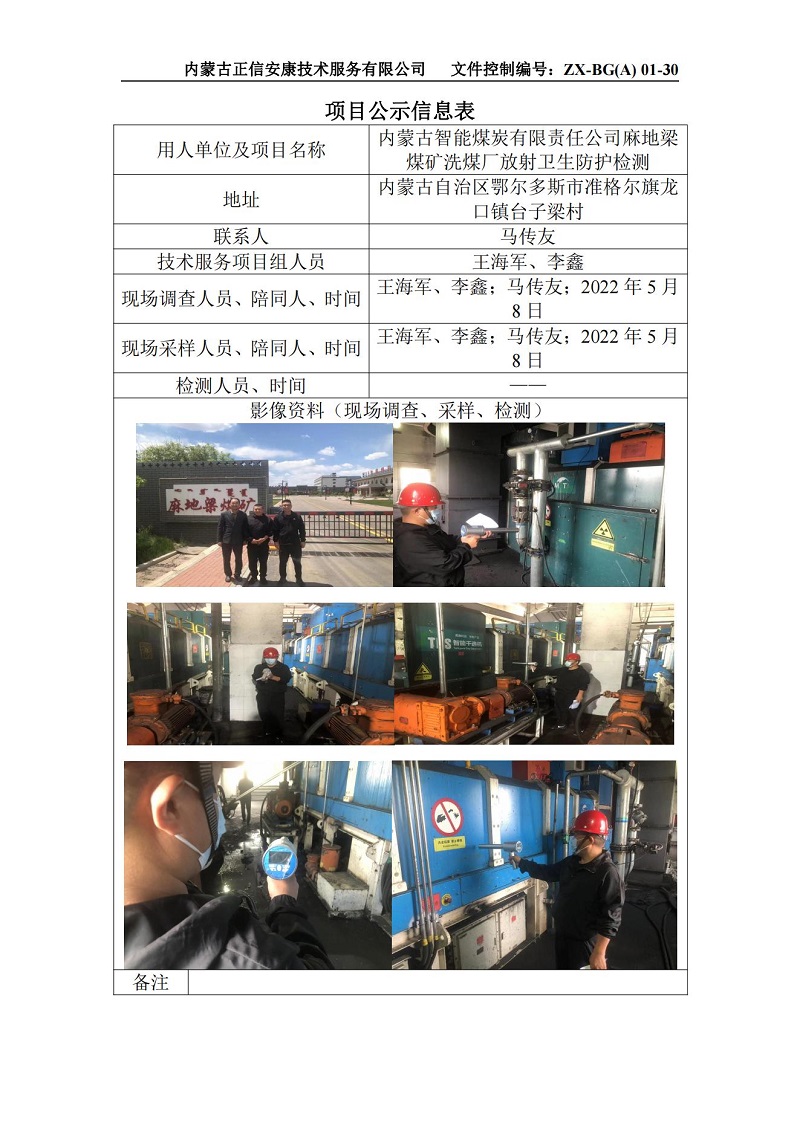 內蒙古智能煤炭有限責任公司麻地梁煤礦洗煤廠(chǎng)放射衛生防護檢測_