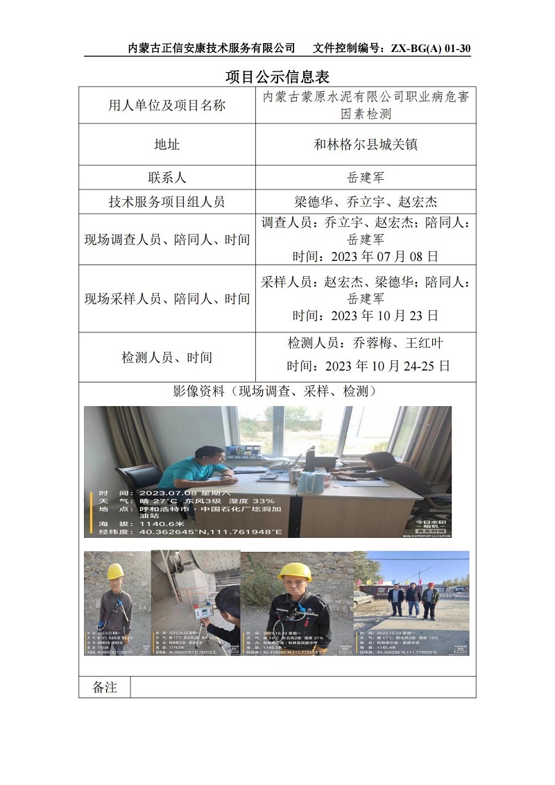 內蒙古蒙原水泥有限公司職業(yè)病危害因素檢測
