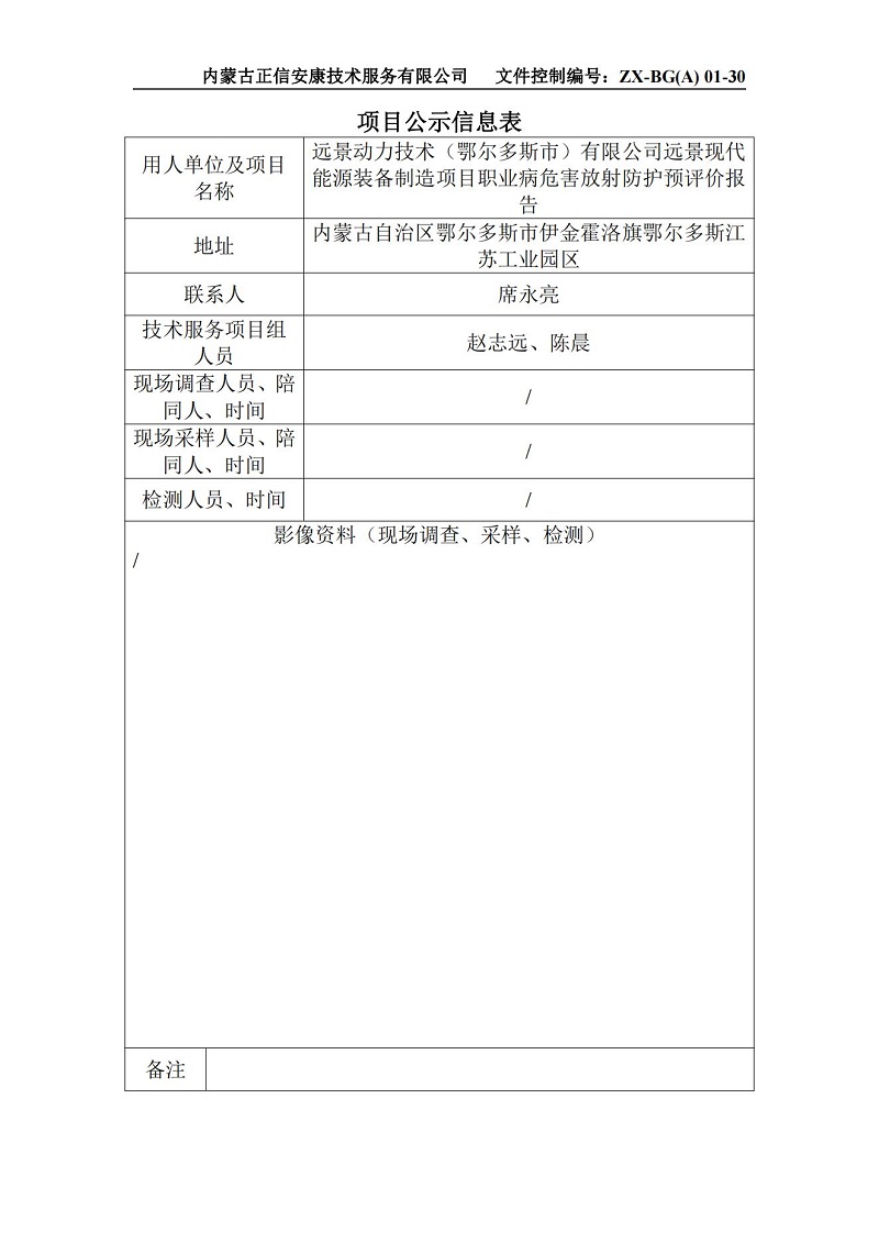 遠景動(dòng)力技術(shù)(鄂爾多斯市)有限公司遠景現代能源裝備制造項目職業(yè)病危害放射防護預評價(jià)報告-項目公示信息表