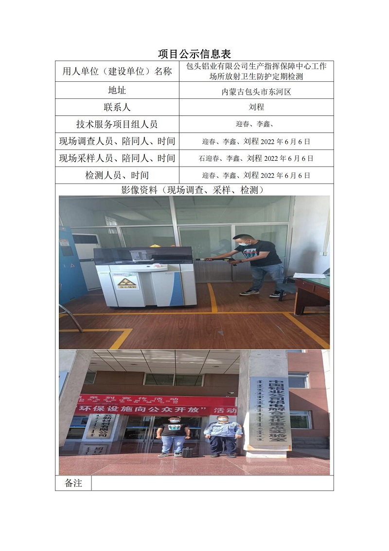 包頭鋁業(yè)有限公司生產(chǎn)指揮保障中心工作場(chǎng)所放射定期檢測項目公示