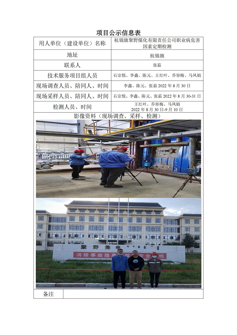 杭錦旗聚野煤化有限責任公司職業(yè)病危害因數定期檢測項目公示