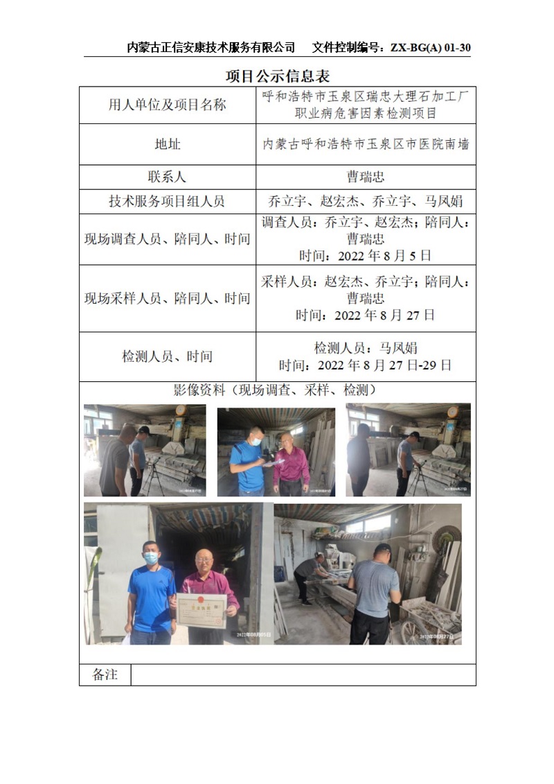 呼和浩特市玉泉區瑞忠大理石加工廠(chǎng)職業(yè)病危害因素檢測項目公示信息表