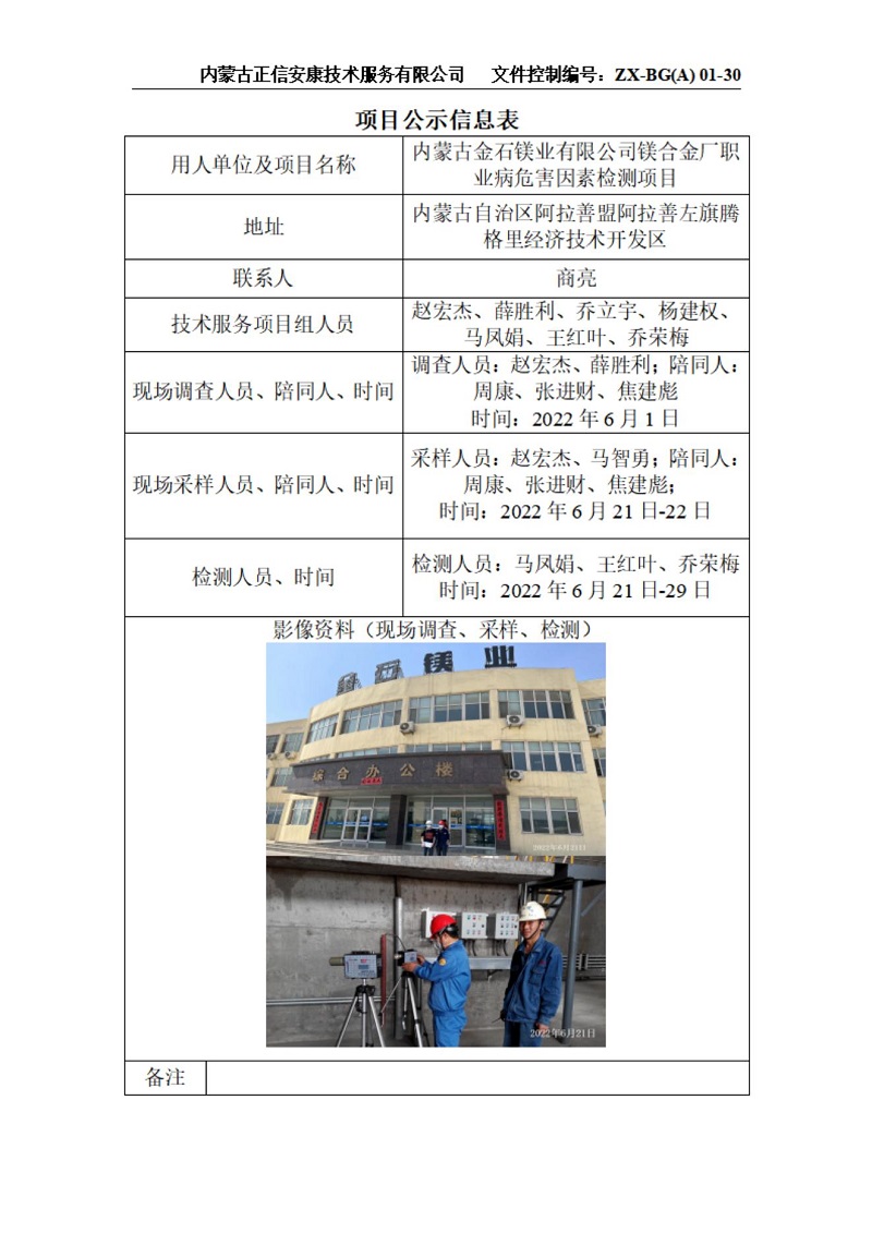 內蒙古金石鎂業(yè)有限公司鎂合金廠(chǎng)職業(yè)病危害因素定期檢測項目公示信息表