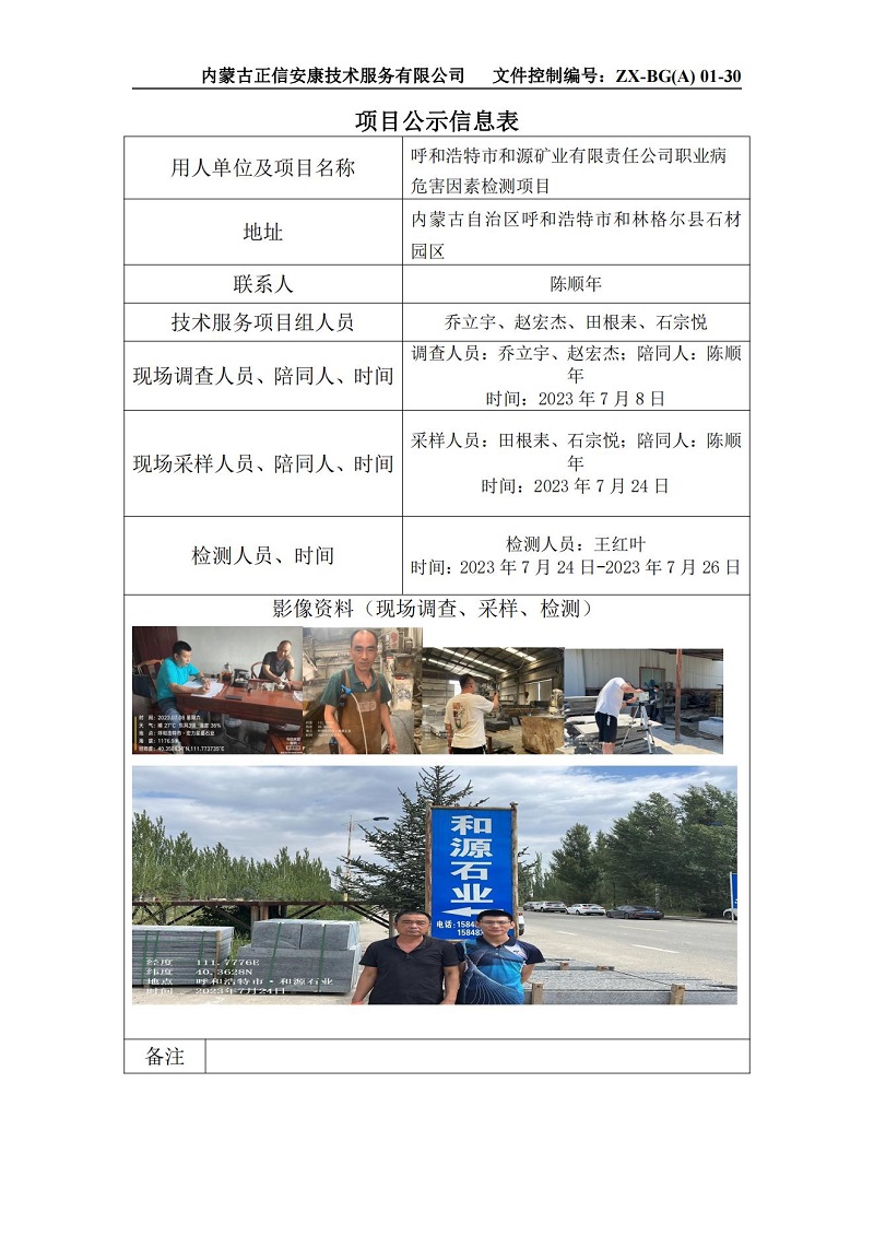 呼和浩特市和源礦業(yè)有限責任公司職業(yè)病危害因素檢測項目公示信息表
