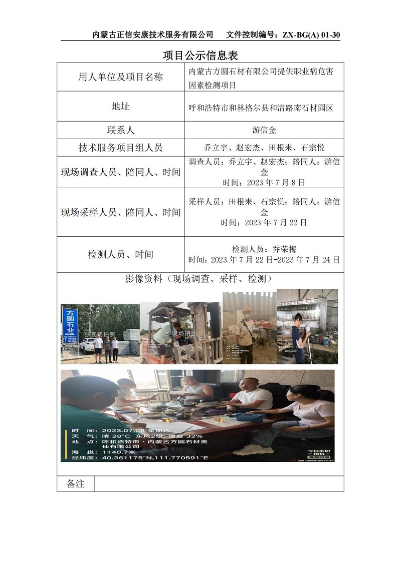 內蒙古方圓石材有限公司職業(yè)病危害因素檢測項目公示信息表