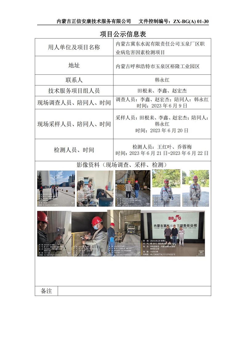內蒙古冀東水泥有限責任公司玉泉廠(chǎng)區項目職業(yè)病危害因素 項目公示信息表_