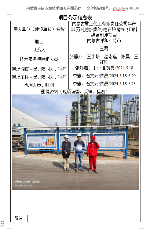 內蒙古君正化工有限責任公司年產(chǎn)55萬(wàn)噸焦爐煤氣/電石爐尾氣制甲醇綜合利用項目職業(yè)病危害控制效果評價(jià)