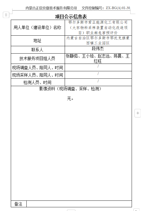 鄂爾多斯市君正能源化工有限公司(大宗物料采樣裝置自動(dòng)化改造項目)職業(yè)病危害預評價(jià)