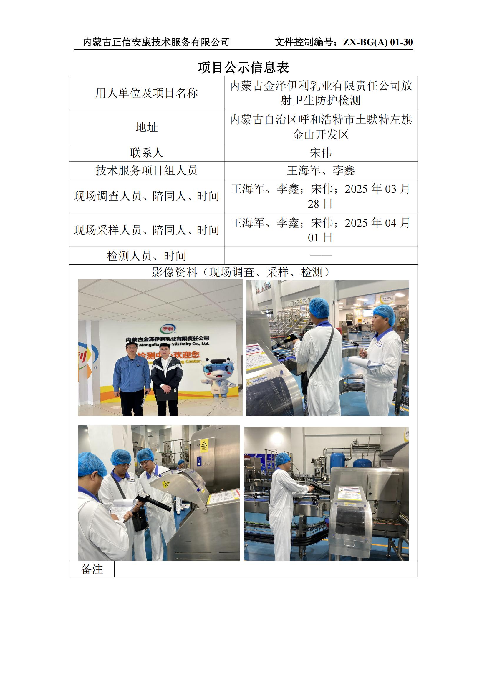 內蒙古金澤伊利乳業(yè)有限責任公司放射衛生防護檢測