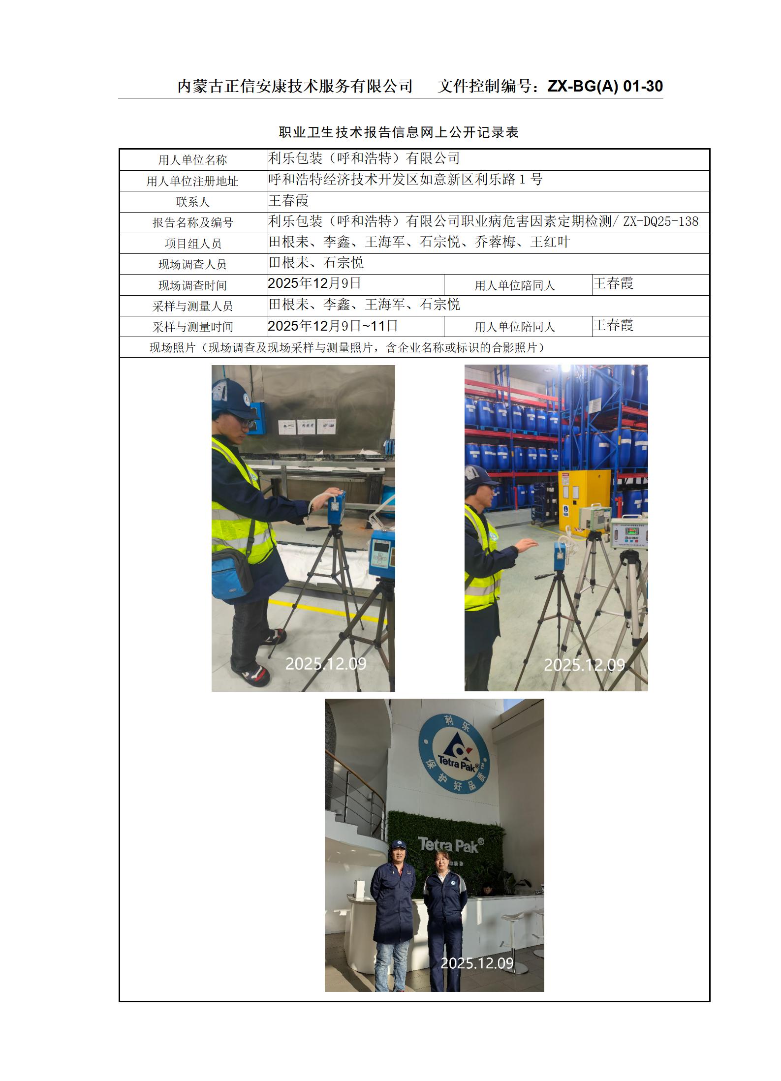 利樂(lè)包裝(呼和浩特)有限公司職業(yè)病危害因素定期檢測(cè)