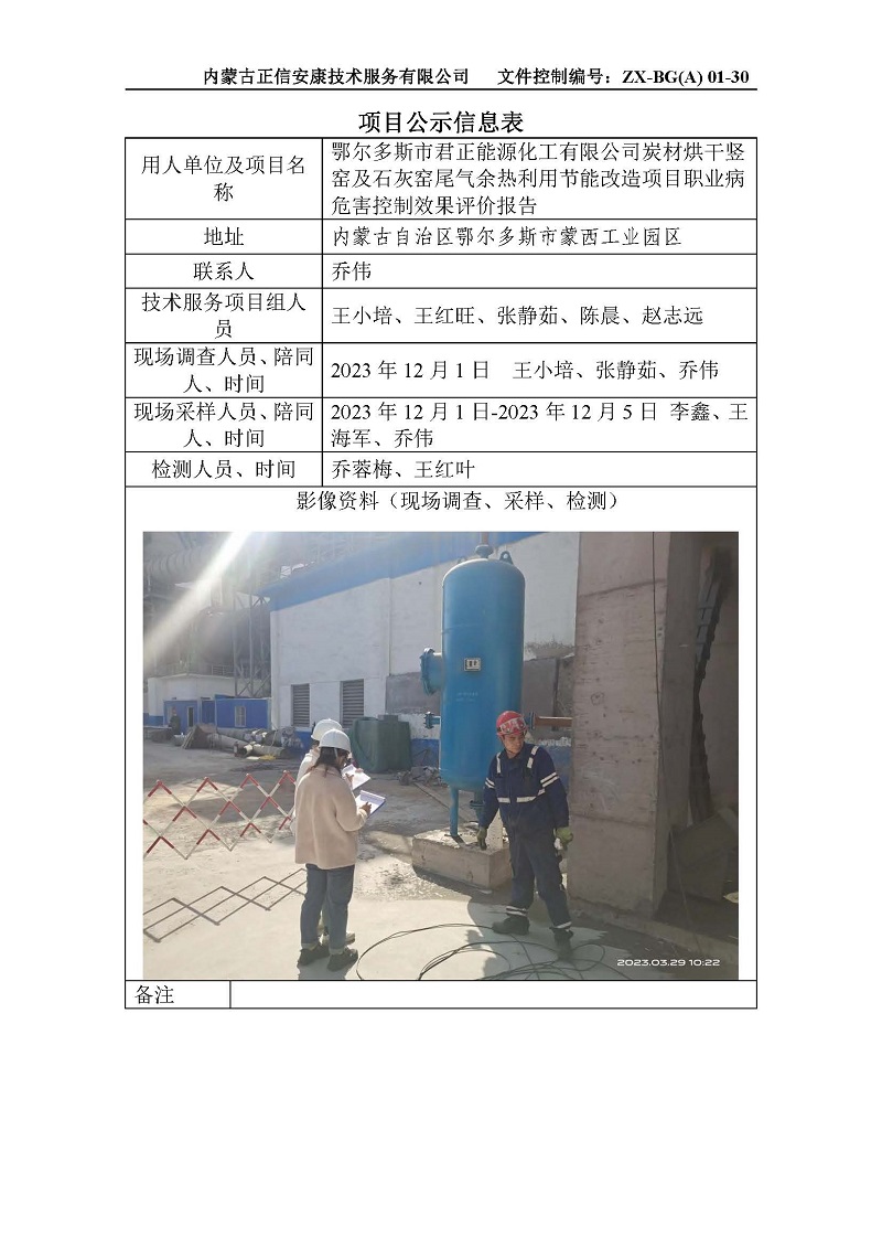 鄂爾多斯市君正能源化工有限公司炭材烘干豎窯及石灰窯尾氣余熱利用節能改造項目職業(yè)病危害控制效果評價(jià)