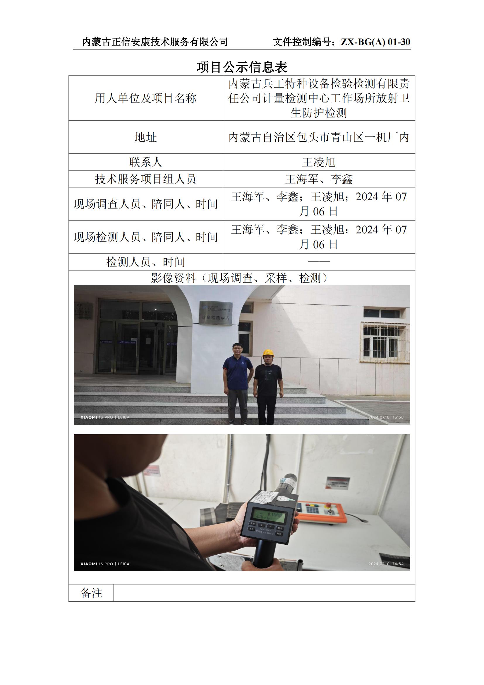 內蒙古兵工特種設備檢驗檢測有限責 任公司計量檢測中心工作場(chǎng)所放射衛 生防護檢測