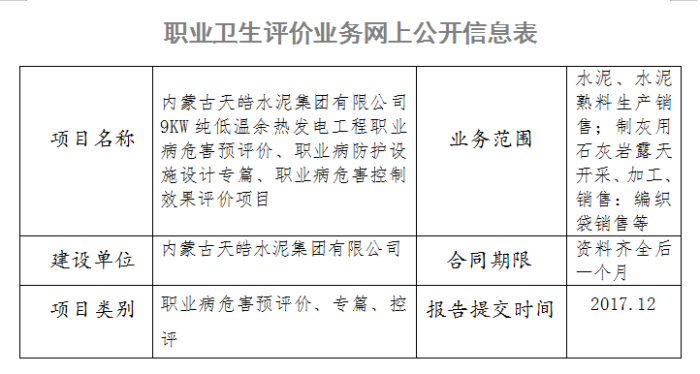 1、內蒙古天皓水泥集團有限公司9KW純低溫余熱發(fā)電工程職業(yè)病危害預評價(jià)、專(zhuān)篇、控制效果評價(jià)項目