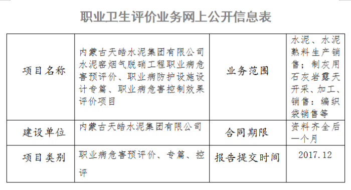 2、內蒙古天皓水泥集團有限公司水泥窯煙氣脫硝工程職業(yè)病危害預評價(jià)、專(zhuān)篇、控制效果評價(jià)項目