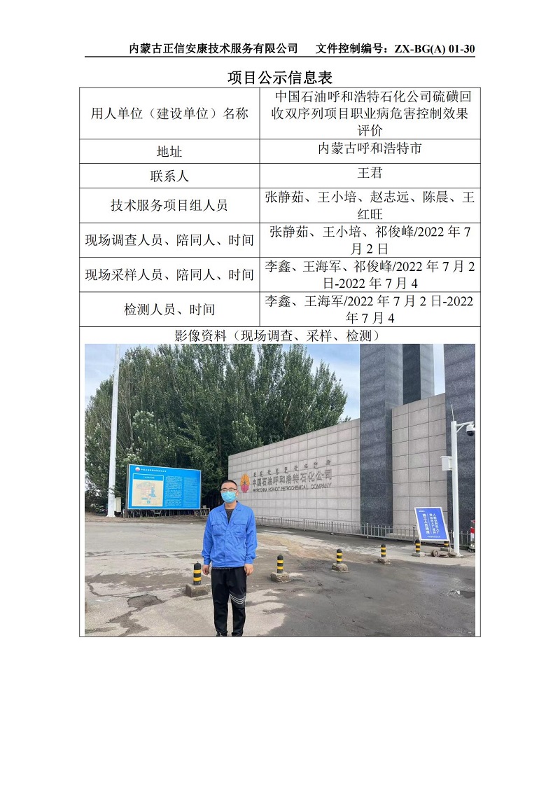 中國石油呼和浩特石化公司硫磺回收雙序列項目職業(yè)病危害控制效果評價(jià)