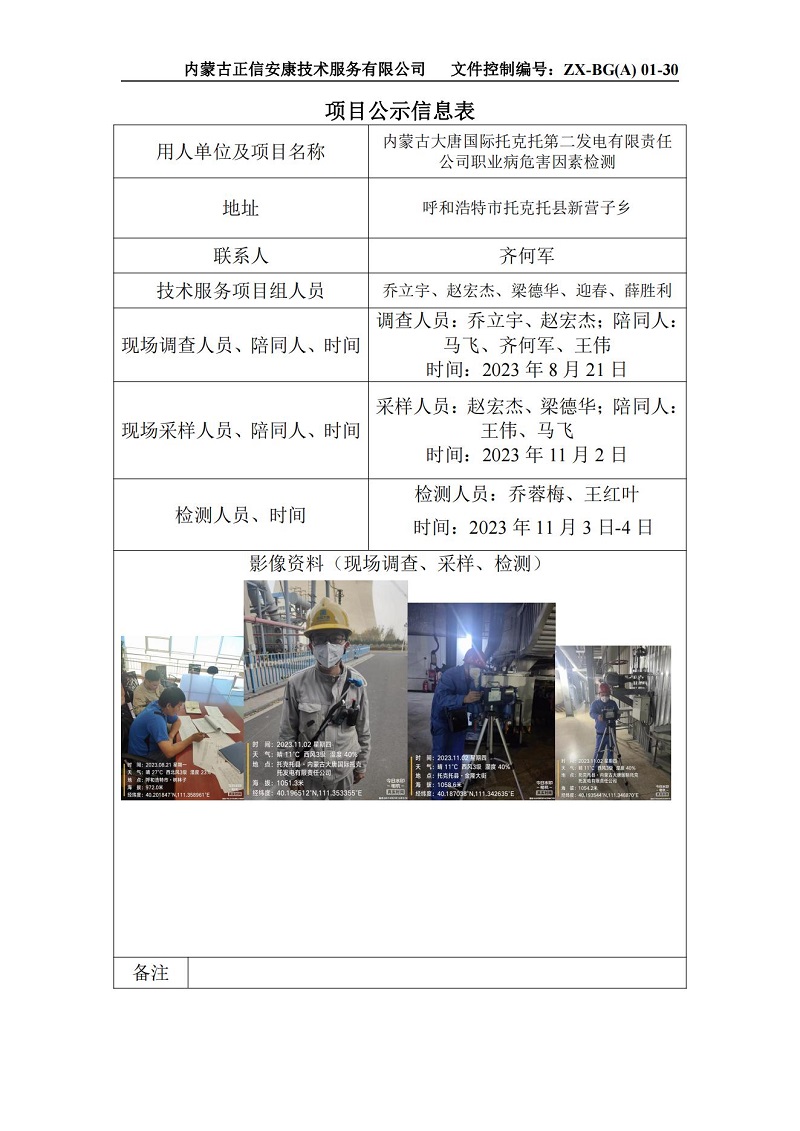 內蒙古大唐國際托克托第二發(fā)電有限責任公司職業(yè)病危害因素檢測項目公示信息表(1)