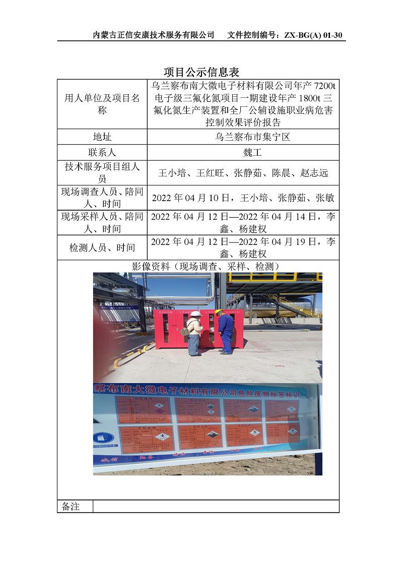 烏蘭察布南大微電子材料有限公司年產(chǎn)7200t電子級三氟化氮項目信息公示表