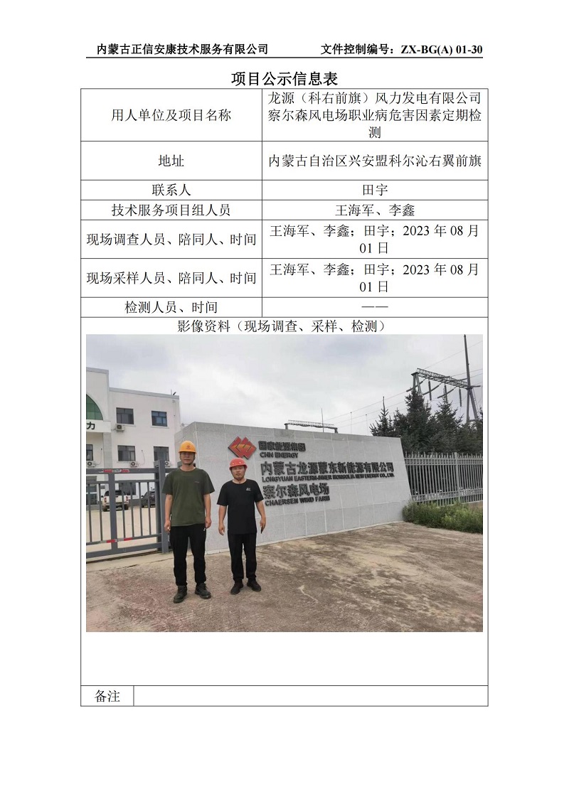 龍源(科右前旗)風(fēng)力發(fā)電有限公司察爾森風(fēng)電場(chǎng)職業(yè)病危害因素定期檢測