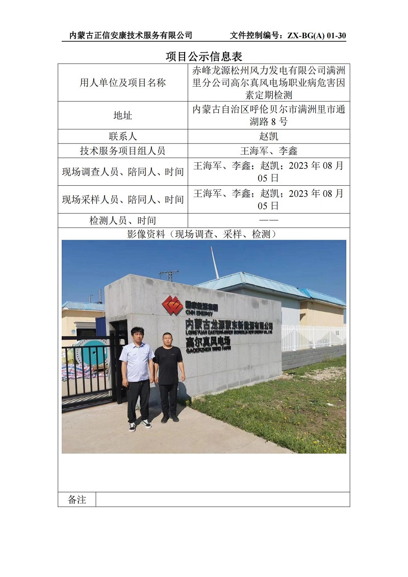 赤峰龍源松州風(fēng)力發(fā)電有限公司滿(mǎn)洲里分公司高爾真風(fēng)電場(chǎng)職業(yè)病危害因素定期檢測