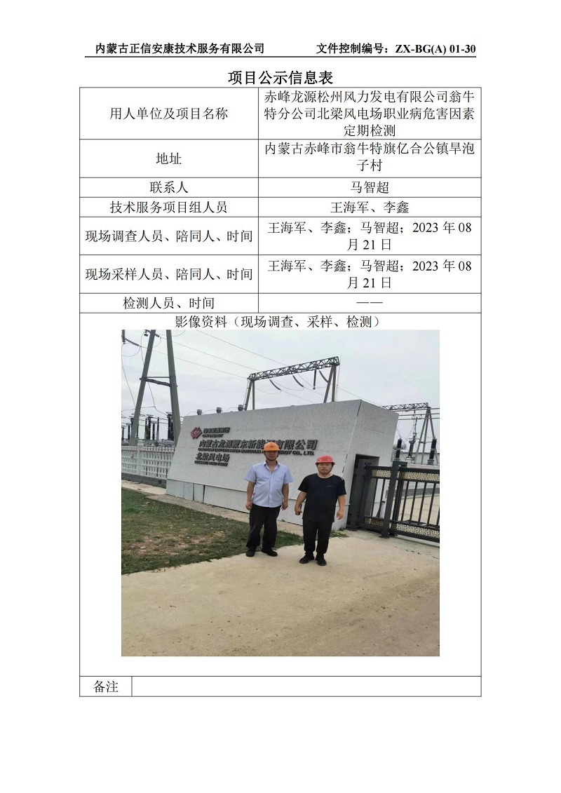 赤峰龍源松州風(fēng)力發(fā)電有限公司翁牛特分公司北梁風(fēng)電場(chǎng)職業(yè)病危害因素定期檢測