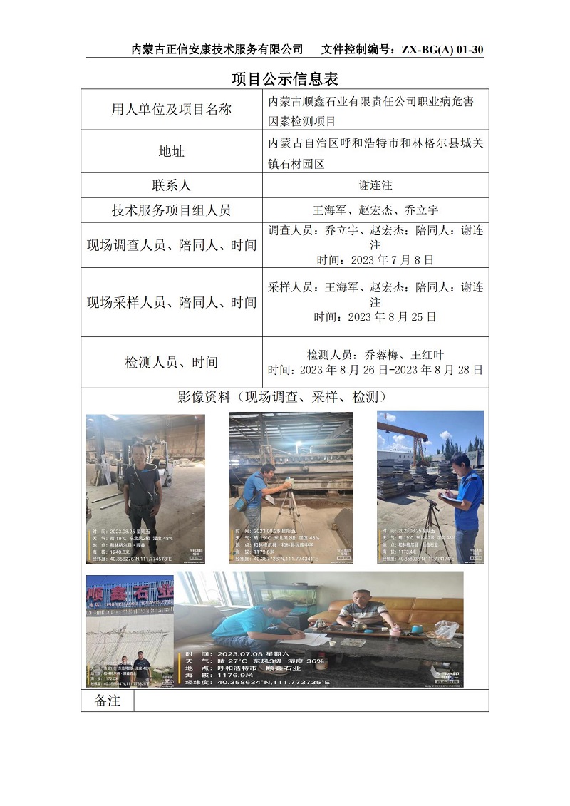內蒙古順鑫石業(yè)有限責任公司職業(yè)病危害因素檢測項目公示信息表