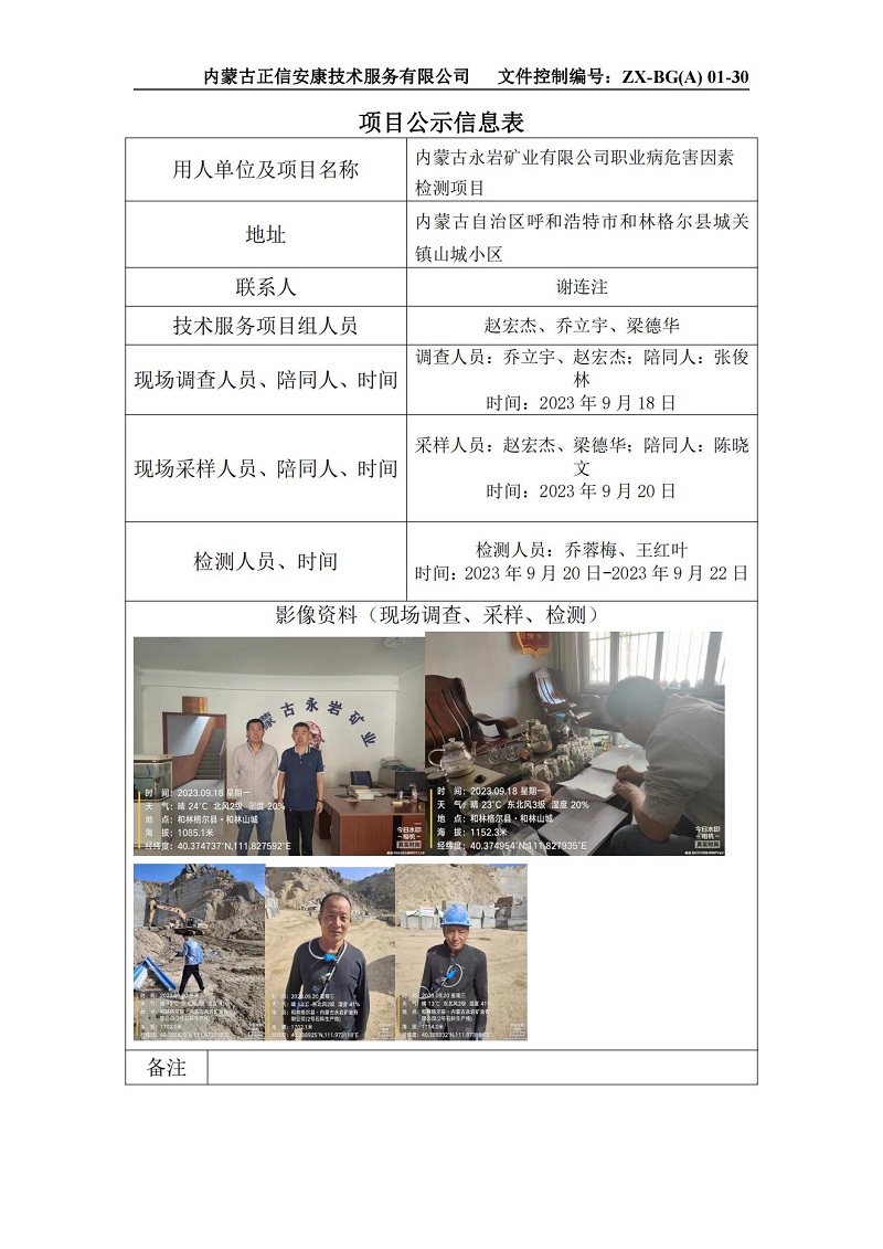 內蒙古永巖礦業(yè)有限公司職業(yè)病危害因素檢測項目公示信息表