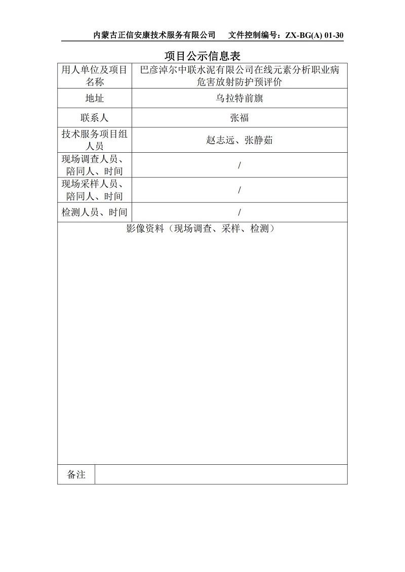巴彥淖爾中聯(lián)水泥有限公司在線(xiàn)元素分析職業(yè)病危害放射防護預評價(jià)-項目公示信息表