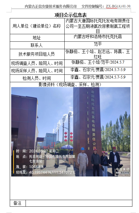 內蒙古大唐國際托克托發(fā)電有限責任公司一至五期液氨改尿素制氨工程項目職業(yè)病危害控制效果評價(jià)