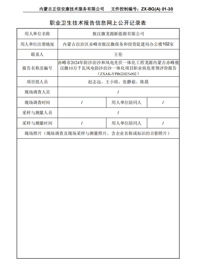 赤峰市2024年防沙治沙和風(fēng)電光伏一體化工程龍源內蒙古赤峰敖漢旗10萬(wàn)千瓦光伏防沙治沙一體化項目職業(yè)病危害預評價(jià)報告
