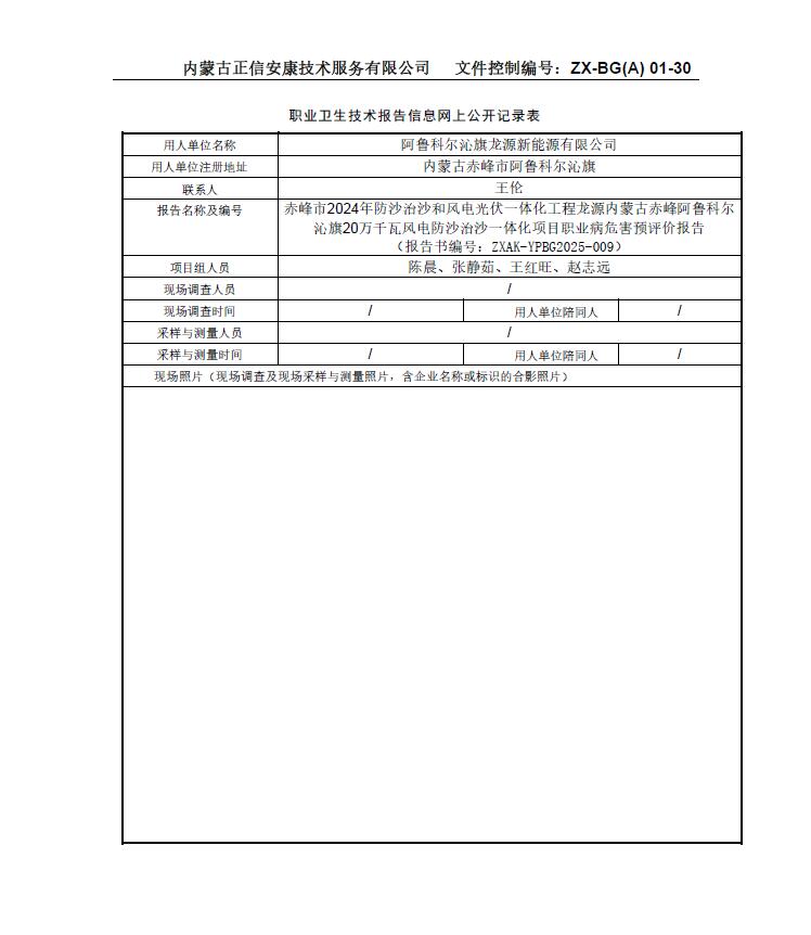 赤峰市2024年防沙治沙和風(fēng)電光伏一體化工程龍源內蒙古赤峰阿魯科爾沁旗20萬(wàn)千瓦風(fēng)電防沙治沙一體化項目職業(yè)病危害預評價(jià)報告