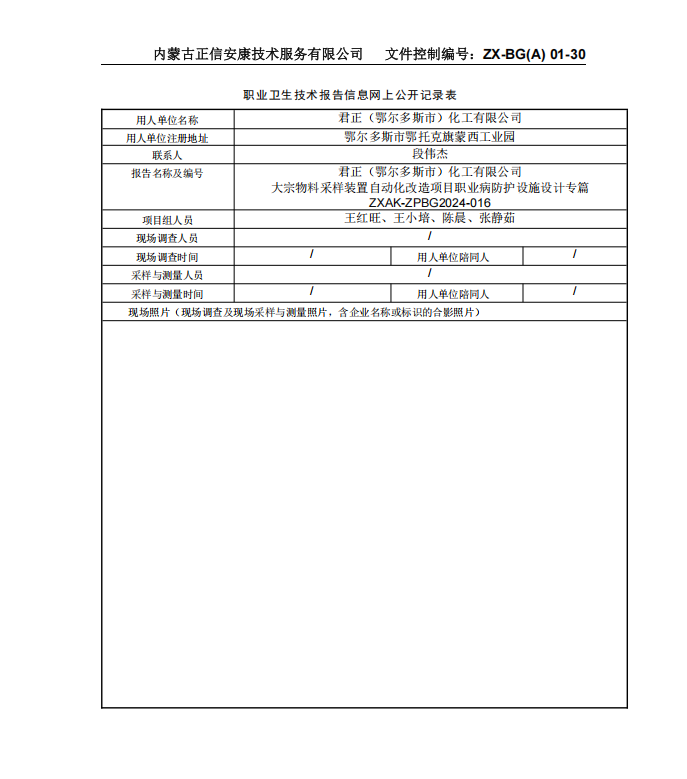 君正(鄂爾多斯市)化工有限公司 大宗物料采樣裝置自動(dòng)化改造項目職業(yè)病防護設施設計專(zhuān)篇