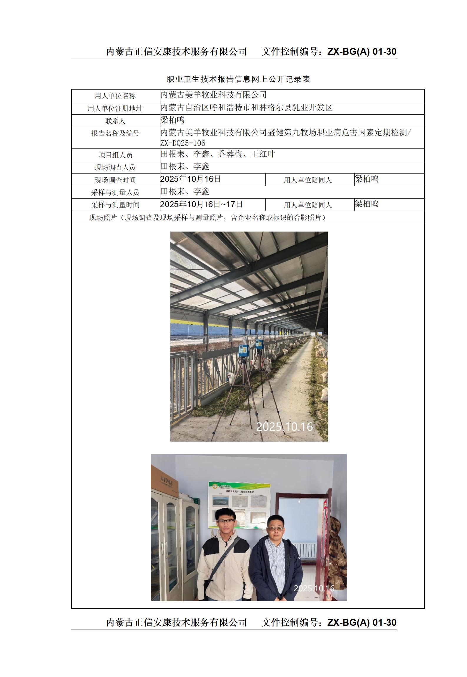 內(nèi)蒙古美羊牧業(yè)科技有限公司盛健第九牧場(chǎng)職業(yè)病危害因素定期檢測(cè)