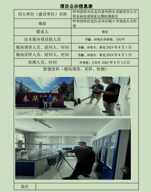 呼和浩特市托克托春華供水有限責任公司職業(yè)病危害因素定期檢測